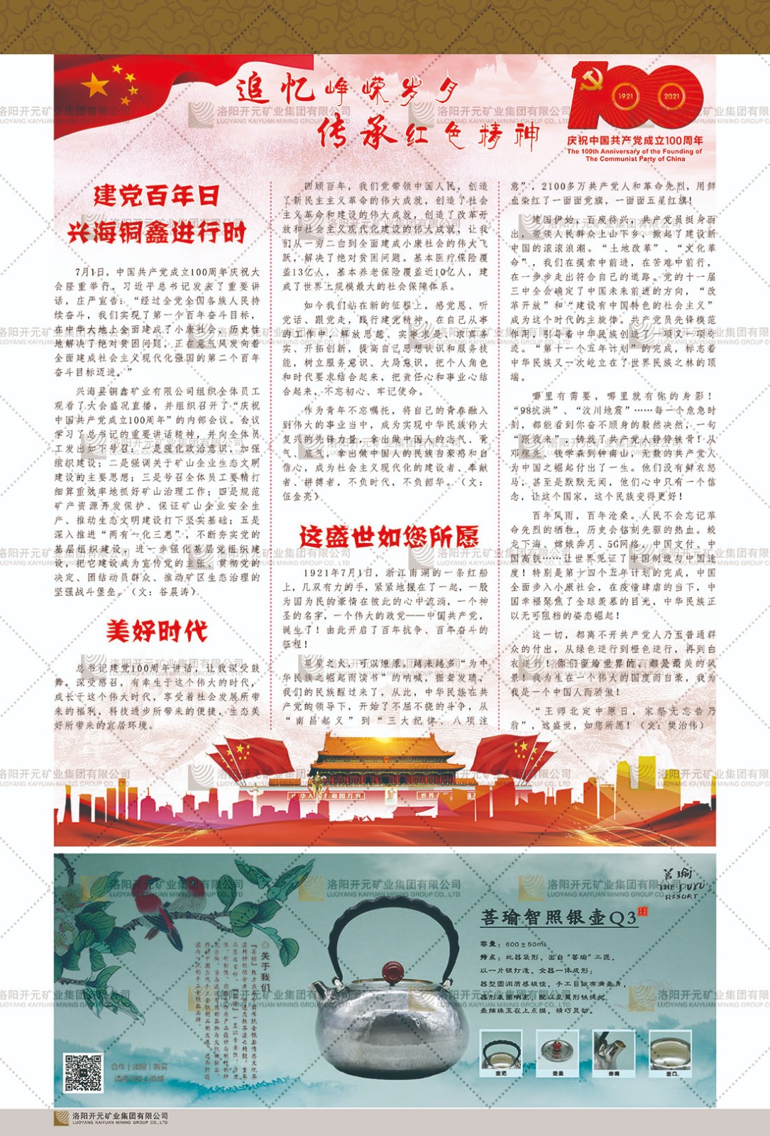 洛陽開元礦業(yè)集團(tuán)有限公司簡介洛陽開元礦業(yè)集團(tuán)有限公司,始成立于2006年,位于洛陽市開元大道269號。集團(tuán)旗下共有五余家全資子公司,業(yè)務(wù)涉及有色金屬礦山開發(fā)、礦產(chǎn)品購銷與進(jìn)出口貿(mào)易、房地產(chǎn)開發(fā)、文化藝術(shù)、企業(yè)管理與咨詢、資本投資等多個(gè)領(lǐng)域。民建河南省委委員、民建河南省委企業(yè)委副主任、民建洛陽市委委員、企業(yè)委主任、洛陽民建企業(yè)家協(xié)會(huì)會(huì)長許明月是公司創(chuàng)始人,現(xiàn)任洛陽開元礦業(yè)集團(tuán)有限公司董事長。在礦業(yè)領(lǐng)域,洛陽開元礦業(yè)集團(tuán)擁有多家實(shí)力雄厚的子公司:貴州開元礦業(yè)有限公司探、采礦權(quán)面積共11.33平方公里;興海縣銅鑫礦業(yè)有限公司探礦權(quán)面積8.76平方公里,礦山資源潛力巨大;2021年,開元集團(tuán)與盧氏中科礦業(yè)有限公司開展戰(zhàn)略合作。盧氏中科礦業(yè)有限公司專注于有色金屬的浮選、加工和銷售,擁有強(qiáng)大的技術(shù)支撐平臺,是集探、采、選、冶、研為一體的中大型綜合礦業(yè)企業(yè)。目前,盧氏中科王家河1000噸選礦廠已成功投產(chǎn),雙河金礦、柳關(guān)欒盧鉛鋅礦相繼順利開工,樓房銀礦與圪老灣鉛鋅礦的深部探礦重大突破,標(biāo)志著礦山版圖取得重大進(jìn)展,為開元集團(tuán)后續(xù)發(fā)展奠定了堅(jiān)實(shí)基礎(chǔ)。在文化傳媒領(lǐng)域,洛陽市明月美術(shù)館通過豐富多樣的藝術(shù)展覽、學(xué)術(shù)研討和公共教育活動(dòng),努力打造一個(gè)集展覽、交流、教育、研究為一體的綜合性藝術(shù)平臺。此外,在金融投資領(lǐng)域,開元集團(tuán)旗下的北京明峰資本管理有限公司專注于投資具有高增長潛力的優(yōu)秀企業(yè),特別是高科技、新能源、環(huán)保等新興產(chǎn)業(yè),為客戶提供個(gè)性化的資產(chǎn)配置服務(wù)。在做好企業(yè)經(jīng)營的同時(shí),開元集團(tuán)始終不忘企業(yè)的社會(huì)責(zé)任和家國情懷,以突出的愛心公益事跡,開展了一系列公益慈善活動(dòng):“民建林”公益事業(yè)通過“思源基金”“幫幫公益”線上公益平臺,與眾多愛心人士籌措資金20余萬元;資助541名貧困大學(xué)生共計(jì)270余萬元,推進(jìn)“數(shù)字助力——河南AI人才培養(yǎng)”;捐款10萬元,馳援京津冀、黑龍江洪水地質(zhì)災(zāi)害……公司于2017年底被洛陽市慈善總會(huì)評為“洛陽慈善風(fēng)云榜——十大愛心集體”。洛陽開元礦業(yè)集團(tuán)有限公司秉承持續(xù)發(fā)展理念,憑借多年來良好的企業(yè)信譽(yù)與經(jīng)營業(yè)績,與全國多家企業(yè)建立了良好合作關(guān)系,受到社會(huì)各界的一致好評,多次榮獲“納稅標(biāo)兵”“先進(jìn)企業(yè)”“招商引資模范企業(yè)”等榮譽(yù)稱號。回望來時(shí)路,開元人勠力同心,以“闖”的精神和“創(chuàng)”的勁頭,一路披荊斬棘,踏過千山萬水;展望新未來,開元人凝心聚力,不執(zhí)于“舊”,無畏于“新”,秉承“勇于跨越,追求卓越”的企業(yè)精神,乘著國家高質(zhì)量發(fā)展新征程的東風(fēng),跨過高山,越過大海,向著集團(tuán)多元化、國際化的目標(biāo),逐夢遠(yuǎn)航,跨越前行!