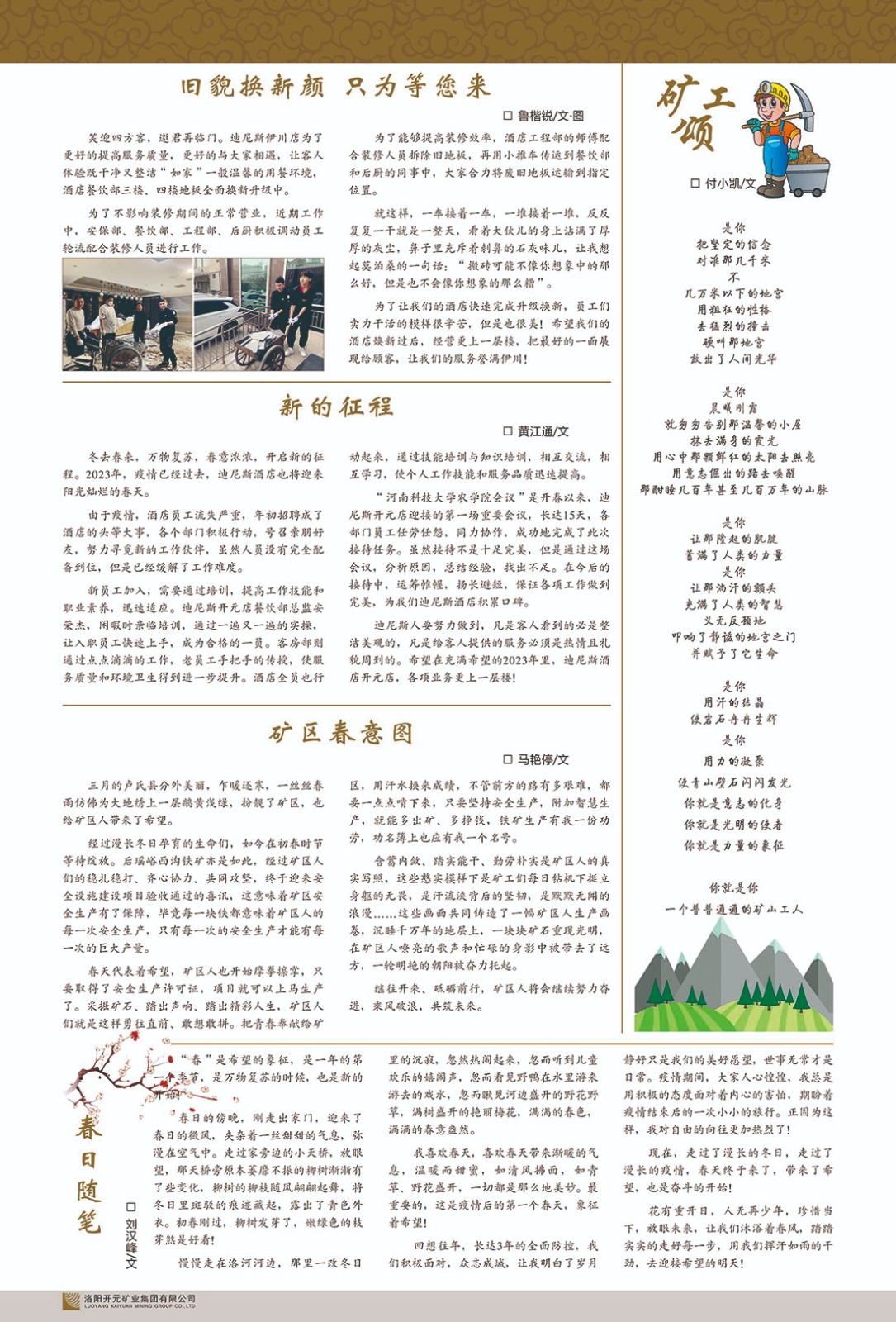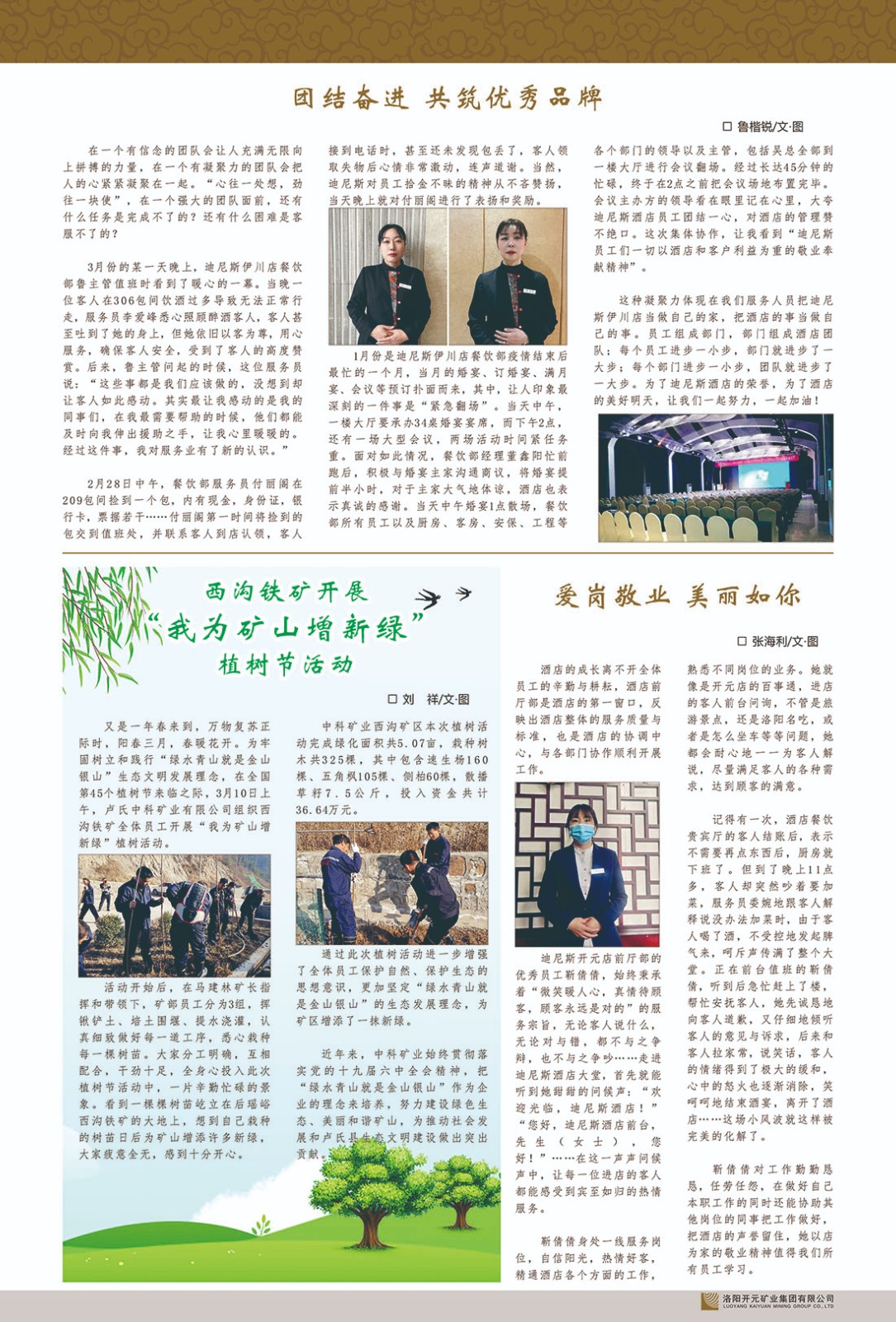 洛陽開元礦業(yè)集團有限公司簡介洛陽開元礦業(yè)集團有限公司,始成立于2006年,位于洛陽市開元大道269號。集團旗下共有五余家全資子公司,業(yè)務(wù)涉及有色金屬礦山開發(fā)、礦產(chǎn)品購銷與進出口貿(mào)易、房地產(chǎn)開發(fā)、文化藝術(shù)、企業(yè)管理與咨詢、資本投資等多個領(lǐng)域。民建河南省委委員、民建河南省委企業(yè)委副主任、民建洛陽市委委員、企業(yè)委主任、洛陽民建企業(yè)家協(xié)會會長許明月是公司創(chuàng)始人,現(xiàn)任洛陽開元礦業(yè)集團有限公司董事長。在礦業(yè)領(lǐng)域,洛陽開元礦業(yè)集團擁有多家實力雄厚的子公司:貴州開元礦業(yè)有限公司探、采礦權(quán)面積共11.33平方公里;興??h銅鑫礦業(yè)有限公司探礦權(quán)面積8.76平方公里,礦山資源潛力巨大;2021年,開元集團與盧氏中科礦業(yè)有限公司開展戰(zhàn)略合作。盧氏中科礦業(yè)有限公司專注于有色金屬的浮選、加工和銷售,擁有強大的技術(shù)支撐平臺,是集探、采、選、冶、研為一體的中大型綜合礦業(yè)企業(yè)。目前,盧氏中科王家河1000噸選礦廠已成功投產(chǎn),雙河金礦、柳關(guān)欒盧鉛鋅礦相繼順利開工,樓房銀礦與圪老灣鉛鋅礦的深部探礦重大突破,標(biāo)志著礦山版圖取得重大進展,為開元集團后續(xù)發(fā)展奠定了堅實基礎(chǔ)。在文化傳媒領(lǐng)域,洛陽市明月美術(shù)館通過豐富多樣的藝術(shù)展覽、學(xué)術(shù)研討和公共教育活動,努力打造一個集展覽、交流、教育、研究為一體的綜合性藝術(shù)平臺。此外,在金融投資領(lǐng)域,開元集團旗下的北京明峰資本管理有限公司專注于投資具有高增長潛力的優(yōu)秀企業(yè),特別是高科技、新能源、環(huán)保等新興產(chǎn)業(yè),為客戶提供個性化的資產(chǎn)配置服務(wù)。在做好企業(yè)經(jīng)營的同時,開元集團始終不忘企業(yè)的社會責(zé)任和家國情懷,以突出的愛心公益事跡,開展了一系列公益慈善活動:“民建林”公益事業(yè)通過“思源基金”“幫幫公益”線上公益平臺,與眾多愛心人士籌措資金20余萬元;資助541名貧困大學(xué)生共計270余萬元,推進“數(shù)字助力——河南AI人才培養(yǎng)”;捐款10萬元,馳援京津冀、黑龍江洪水地質(zhì)災(zāi)害……公司于2017年底被洛陽市慈善總會評為“洛陽慈善風(fēng)云榜——十大愛心集體”。洛陽開元礦業(yè)集團有限公司秉承持續(xù)發(fā)展理念,憑借多年來良好的企業(yè)信譽與經(jīng)營業(yè)績,與全國多家企業(yè)建立了良好合作關(guān)系,受到社會各界的一致好評,多次榮獲“納稅標(biāo)兵”“先進企業(yè)”“招商引資模范企業(yè)”等榮譽稱號?;赝麃頃r路,開元人勠力同心,以“闖”的精神和“創(chuàng)”的勁頭,一路披荊斬棘,踏過千山萬水;展望新未來,開元人凝心聚力,不執(zhí)于“舊”,無畏于“新”,秉承“勇于跨越,追求卓越”的企業(yè)精神,乘著國家高質(zhì)量發(fā)展新征程的東風(fēng),跨過高山,越過大海,向著集團多元化、國際化的目標(biāo),逐夢遠航,跨越前行!